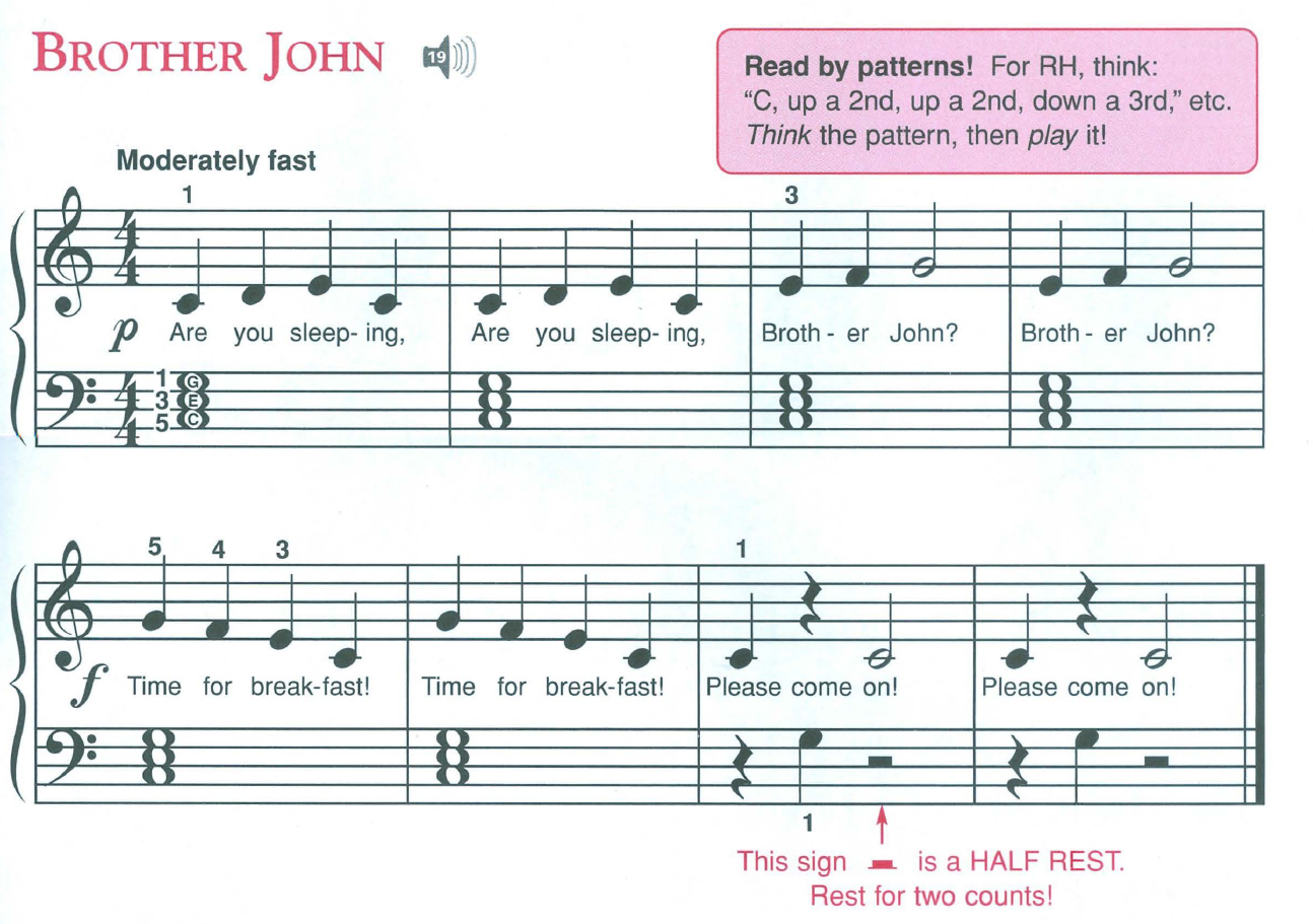 You’ll notice that in both the treble and bass staffs in Brother John, there’s a lightning-shaped squiggly line. This means “rest for one count” (out of four). Then, the little hockey puck means “half rest”, which is “resting for two counts”. Why not just not put any notes at all?! Instead of the strange arbitrary shapes?? But what do I know.